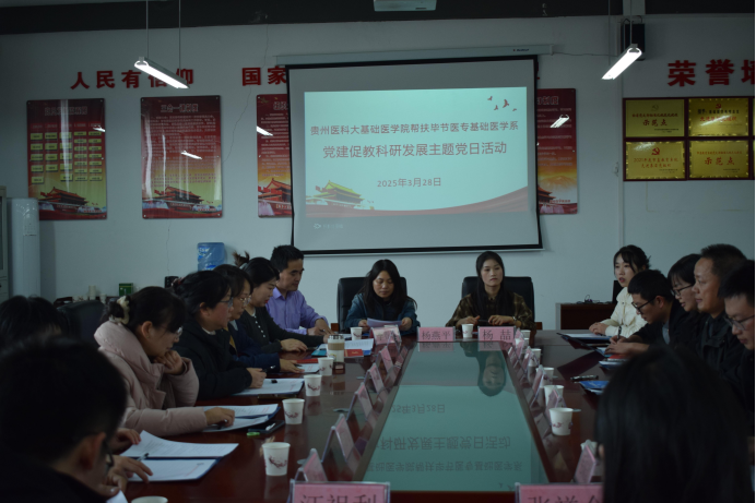 首先,在基础医学系B5 栋六楼党员活动室开展“贵州医科大基础医学院帮扶毕节医专基础医学系党建促教科研 业务发展主题党日活动”,双方围绕“党建+业务”融合路径展开研讨,基础医学系党总支书记薛永胜同志向专家团队简要介绍了毕节医专基础医学系在党建引领下的工作情况, 开展党建“双创”,打造“1314”党建工作法,在职工党员发展、文章发表以及申报课题等都取得明显成效。同时,由于学校没有科研平台以及缺乏申报“技能贵州”等项目创建, 基础医学系老师们难以取得高水平的教科研成果,在科学研究以及职称晋升方面存在困难等问题,希望得到贵州医科大专家们的指导和帮扶。贵州医科大学基础医学院第六党支部洪艳书记分享了创建“团结进取型”党支部的经验,包括“双带头人”机制、课程思政融入、科研团队建设等。在互动环 节,基础医学系老师们提出科研资源匮乏、科研能力提升困 难等实际问题,洪艳教授等专家们现场一一答疑解惑,并表示下一步将通过联合申报课题、实验平台共享等方式提供支持和帮助。